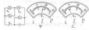 13.下图是用电压表测量电压的实验电路图,电压表所用量程不明,电压表V1、V2的指针位置分别如右图甲、乙所示。则电压表V1、V2的读数分别为_________、_________,L2两端的电压为--。