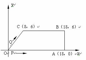 如图,在直角坐标系中,O是原点,A、B、C三点的坐标分别为A(18,0),B(18,6),C(8,6),四边形OABC是梯形,点P、Q同时从原点出发,分别坐匀速运动,其中点P沿OA向终点A运动,速度为每秒1个单位,点Q沿OC、CB向终点B运动,当这两点有一点到达自己的终点时,另一点也停止运动。