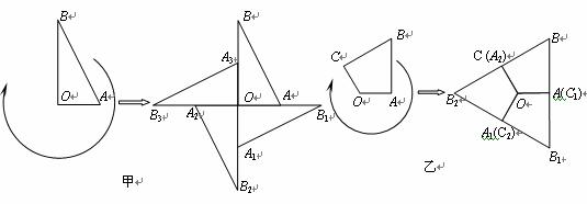 12.如图所示,在图甲中,Rt△OAB绕其直角顶点O每次旋转90˚,旋转三次得到右边的图形.在图乙中,四边形OABC绕O点每次旋转120˚,旋转二次得到右边的图形.