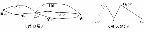 13.“五一”黄金周期间,梁先生驾驶汽车从甲地经过乙地到丙地游玩.甲地到乙地有2条公路,乙地到丙地有3条公路.每一条公路的长度如下图所示(单位:km).梁先生任选一条从甲地到丙地的路线,这条路线正好是最短路线的概率是 .