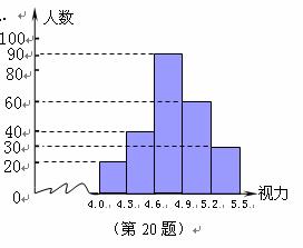 20.(本题满分8分)根据市学校卫生保健所对今年参加中考的学生体检情况,教育局有关部门对今年参加中考的学生的视力进行了一次抽样调查,得到频数分布直方图(如图).(每组数据含最小值,不含最大值)