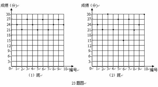 23.(本题6分)某数学老师为了了解学生在数学学习中常见错误的纠正情况,收集了学生在作业和考试中的常见错误,编制了10道选择题,每题3分,对她所任教的初三(1)班和(2)班进行了检测.如图表示从两班各随机抽取的10名学生的得分情况: