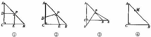 在斜边AB的中点P处,将三角板绕点P旋转,三角板的两直角边分别交射线AC、CB于D、E两点。图①,②,③是旋转三角板得到的图形中的3种情况。