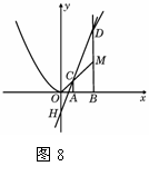 数学课上,老题出示图和下面的条件:“如图8,在直角坐标平面内,O为坐标原点,A点坐标为(1,0),点B在x轴上且在点A的右侧,AB=OA。过点A和B分别作x轴的垂线,分别交二次函数y=x2的图象于点C和D。直线OC交BD于点M,直线CD交y轴于点H。记点C、D的横坐标分别为xC、xD,点H的纵坐标为yH 。”