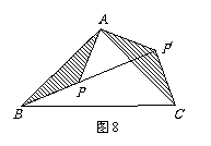 如图8,△ABC是等腰直角三角形,BC是斜边,点P是△ABC内一定点,延长BP至P/,将△ABP绕点A旋转后,与△ACP/重合,如果AP=