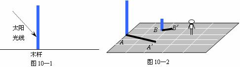 (1)一木杆按如图10-1所示的方式直立在地面上,请在图中画出它在阳光下的影子(用线段CD表示);