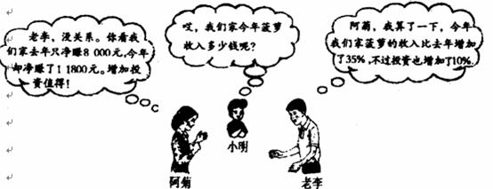 请称用学过的知识帮助小明算出他们家今年菠萝的收入。(收入-投资=净赚)