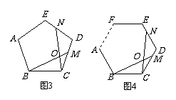 ① 如图4,在正n(n≥3)边形ABCDEF…中,M、N分别是CD、DE上的点,BM与CN相交于点O,问当∠BON等于多少度时,结论BM = CN成立?(不要求证明)