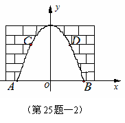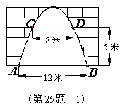 25.如图,某地一古城墙门洞呈抛物线形,已知门洞的地面宽度AB=12米,两侧距地面5米高C、D处各有一盏路灯,两灯间的水平距离CD=8米,求这个门洞的高度. (提示:选择适当的位置为原点建立直角坐标系,例如下右图:以AB的中点为坐标原点建立直角坐标系.)(本题7分)
