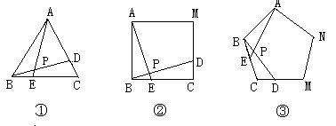 如图①、②、③中,点E、D分别是正三角形ABC、正四边形ABCM、正五边形ABCMN中以C为顶点的相邻两边上的点,且BE=CD,DB交AE于P点。