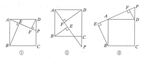 (1)请探索BE、DF、EF这三条线段长度具有怎样的数量关系,若点P在DC的延长线上(如图②),那么这三条线段的长度之间又有怎样的数量关系?若点在CD的延长线上呢(如图③)?请分别直接写出结论.