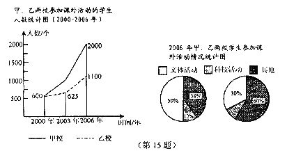 15.下面两幅统计图,反映了某市甲,乙两所中学学生参加课外活动的情况,通过图中信息可知2006年甲,乙两所中学参加科技活动的学生人数共有 人。
