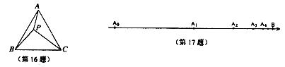 16.如图,P是等边△ABC内一点,若PA∶PB∶PC=3∶4∶5,则∠APB的度数是 。