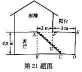 21.(10分)汪老师要装修自己带阁楼的新居(如图为新居剖面图),在建造客厅到阁楼的楼梯AC时,为避免上楼时墙角F碰头,设计墙角F到楼梯的竖直距离FG为1.75m.他量得客厅高AB=2.8m,楼梯洞口宽AF=2m,阁楼阳台宽EF=3m.请你帮助汪老师解决下列问题: