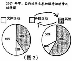 下面两幅统计图(如图l 、图2 ) ,反映了某市甲、乙两所中学学生参加课外活动的情况,请你通过图中信息回答下面的问题。