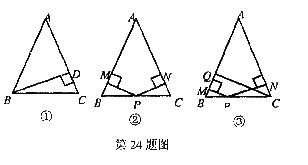 (1)①在图①中,求BD的长; ②在图②中,P是BC的中点,求PM+PN