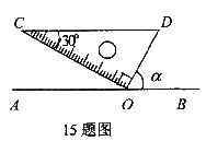 15.如图,将三角板的直角顶点放置在直线AB上的点O处,使斜边CD∥AB。则