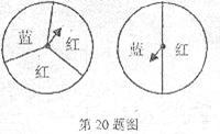 20.小颖为九年级l班毕业联欢会设计了一个“配紫色”的游戏:下面是两个可以自由转动的转盘,每个转盘被分成面积相等的几个扇形,游戏者同时转动两个转盘,两个转盘停止转动时,若有一个转盘的指针指向蓝色,另一个转盘的指针指向红色,则“配紫色”成功,游戏者获胜.求游戏者获胜的概率.(本题满分7分)