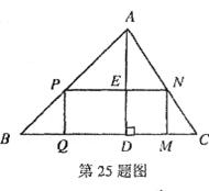 25.如图,△ABC是一块锐角三角形余料,边BC=120 mm,高AD=80mm,要把它加工成长方形零件PQMN,使K方形PQMN的边QM在BC上,其余两个项点P,N分别在AB,AC上.