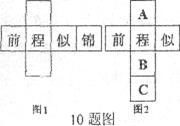 10.在一个立方体的其中四个面上分别写着“前程似锦”四个字,把这个立方体按一定方式展开后,四个字的位置如图l所示;若将这个立方体按图2方式展开后,其中“锦”字应在图2中的 处(填A、B或C).