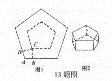 13.将一块正五边形硬纸片(如图l),做成一个底面仍为正五边形且高相等的无盖纸盒(侧面均垂直于底面,边缝忽略不计,如图2),需在每一个顶点处剪去一个四边形,如图1中的四边形ABCD,那么∠BCD的大小是 °.