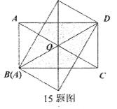 15.如图,在矩形ABCD中,AB=6,AD=8,AC、BD交于点D.若把矩形ABCD绕点0旋转,使A与B重合,则两矩形公共部分的面积等于 .