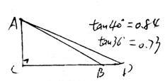 20、下面左图为一楼房楼梯的侧截面图,原设计坡角∠ABC为40°,后考虑到安全标准,将坡角减至∠ADC=36°,若楼梯高2米,问楼梯多占地长多少长? (10分)