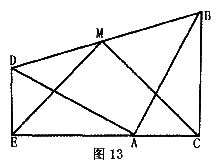 24.(本题满分l2分)两个全等的含30°,60°角的三角板ADE和三角板ABC,如图13所示放置,E、A、C三点在一条直线上,连接BD,取BD的中点M,连接ME、MC,试判断△EMC的形状,并说明理由.