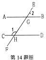 14.如图,已知AB∥CD,EF分别交AB、CD于G、H,∠1=130°,则∠2的度数是 。