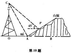 19.(满分8分)如图,某人在山坡坡脚A处测得电视塔尖点C的仰角为60º,沿山坡向上走到P处再测得点C的仰角为45º,已知PA=100m,山坡的坡度为l∶2且O、A、B在同一条直线上,求电视塔OC的高度以及此人所在位置点 P的铅直高度(结果保留根号形式)。