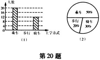 20.(8分)学习了统计知识后,小刚就本班同学的上学方式进行了一次调查统计。图(1)和图(2)是他通过采集数据后,绘制的两幅不完整的统计图,请你根据图中提供的信息,解答以下问题: