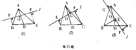 绕O点旋转到与AD不垂直时,如图2,图3两种情况下,线段BE,CF,AG又有怎样的数量关系?写出你的猜想,并对图3的猜想给予证明。