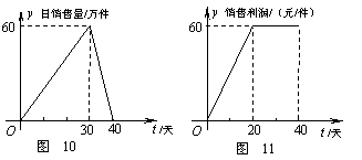某公司专销产品A,第一批产品A上市40天内全部售完.该公司对第一批产品A上市后的市场销售情况进行了跟踪调查,调查结果如图所示,其中图10中的折线表示的是市场日销售量与上市时间的关系;图11中的折线表示的是每件产品A的销售利润与上市时间的关系.
