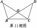 11.如图,AC、BD相交于点O,∠A=∠D,请你再补充一个条件,使得△AOB≌△DOC,你补充的条件是 。