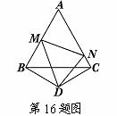 16.如图,△ABC是边长为3的等边三角形,△BDC是等腰三角形,且∠BDC=120°.以D为顶点作一个60°角,使其两边分别交AB于点M,交AC于点N,连接MN,则△AMN的周长为 。