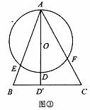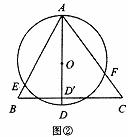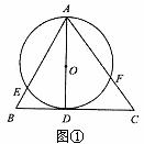 如图①,AD是圆O的直径,BC切圆O于点D,AB、AC与圆O相交于点E、F。