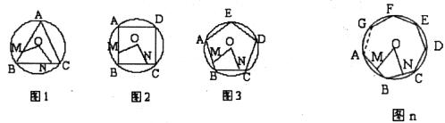 如图l、2、3、…、n,M、N分别是⊙O的内接正三角形ABC、正方形ABCD、正五边形ABCDE、…、正n边形ABCDE…的边AB、BC上的点,且BM=CN,连结OM、ON.
