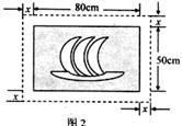 7.在一幅长80cm,宽50cm的矩形风景画的四周镶一条金色纸边,制成一幅矩形挂图,如图2所示,如果要使整个挂图的面积是5400cm2,设金色纸边的宽为