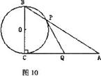 26、(本小题11分)如图10,在△ABC中,∠BCA=90°,以BC为直径的⊙O交AB于点P,Q是AC的中点。
