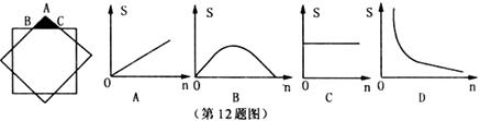 12.如图,两块完全重合的正方形纸片,如果上面的一块绕正方形的中心O左0º-90º的旋转,那么旋转时露出的△ABC的面积(S)随着旋转角度(n)的变化而变化,下面表示S与n关系的图像大致是