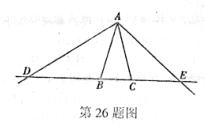 26.(本分满分12分)如图,在△ABC中,AB=AC=1,点D,E在直线BC上运动.设BD=