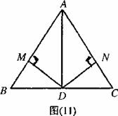 已知:如图(11),在△ABC中,AD平分∠BAC,点D是BC的中点,DM⊥AB,DN⊥AC,垂足分别为M、N.