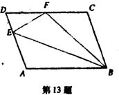 13.如图平行四边形ABCD中,点E在边AD上,以BE为折痕,将△ABE向上翻折,点A正好落在CD上的点F,若△FDE的周长为8,△FCB的周长为22,则FC的长为_________。