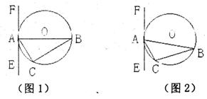 (2)如图2,AB为⊙O的弦(非直径),如果(1)所添的条件仍成立的话,EF还是⊙O的切线吗?若是,写出证明过程;若不是,请说明理由。