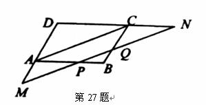 27.(8分)如图所示,直线MN平行于□ABCD的对角线AC,且分别交DA、DC的延长线于M点、N点,分别交BA、BC于P点、Q点。