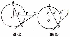 (2)若将图①中的半径OB所在直线向上平行移动交OA于F,交⊙O于B′,其他条件不变(如图②),那么上述结论CD=CE还成立吗?为什么?
