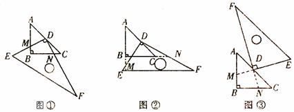 (3)继续旋转至如图③的位置,延长FD交BC于N,延长ED交AB于M,DM=DN是否仍然成立?请写出结论,不用证明。