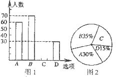 图l、2是根据调查结果绘制的两幅不完整的统计图,请你根据统计图提供的信息,在图1中将选项C的部分补充完整.