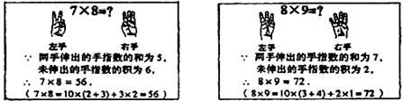 15.法国的“小九九”从“一一得一”到“五五二十五”和我国的“小九九”是一样的,后面的就改用手势了。下面两个图框使用法国“小九九”计算7×8和8×9的两个示例。若用法国的“小九九”计算7×9,左、右手依次伸出手指的个数是