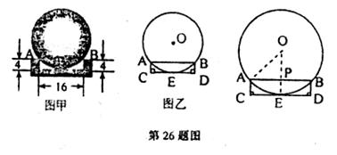图乙是过球心O及A,B,E三个接触点的截面示意图。已知⊙O的直径就是铁球的直径。AB是⊙O的弦,CD切⊙O于点E,AC⊥CD,BD⊥CD。请你结合图甲中的数据,计算这种铁球的直径。